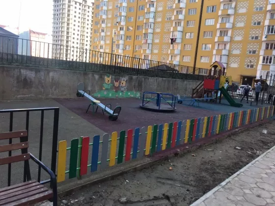 Двор благоустроенный, есть детская площадка, спортивная площадка, закрытая территория.